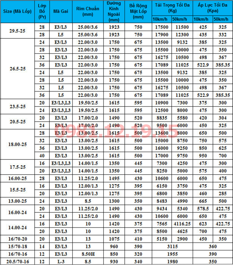Bảng Thông Số Kĩ Thuật Các Mã Lốp Xúc Lật